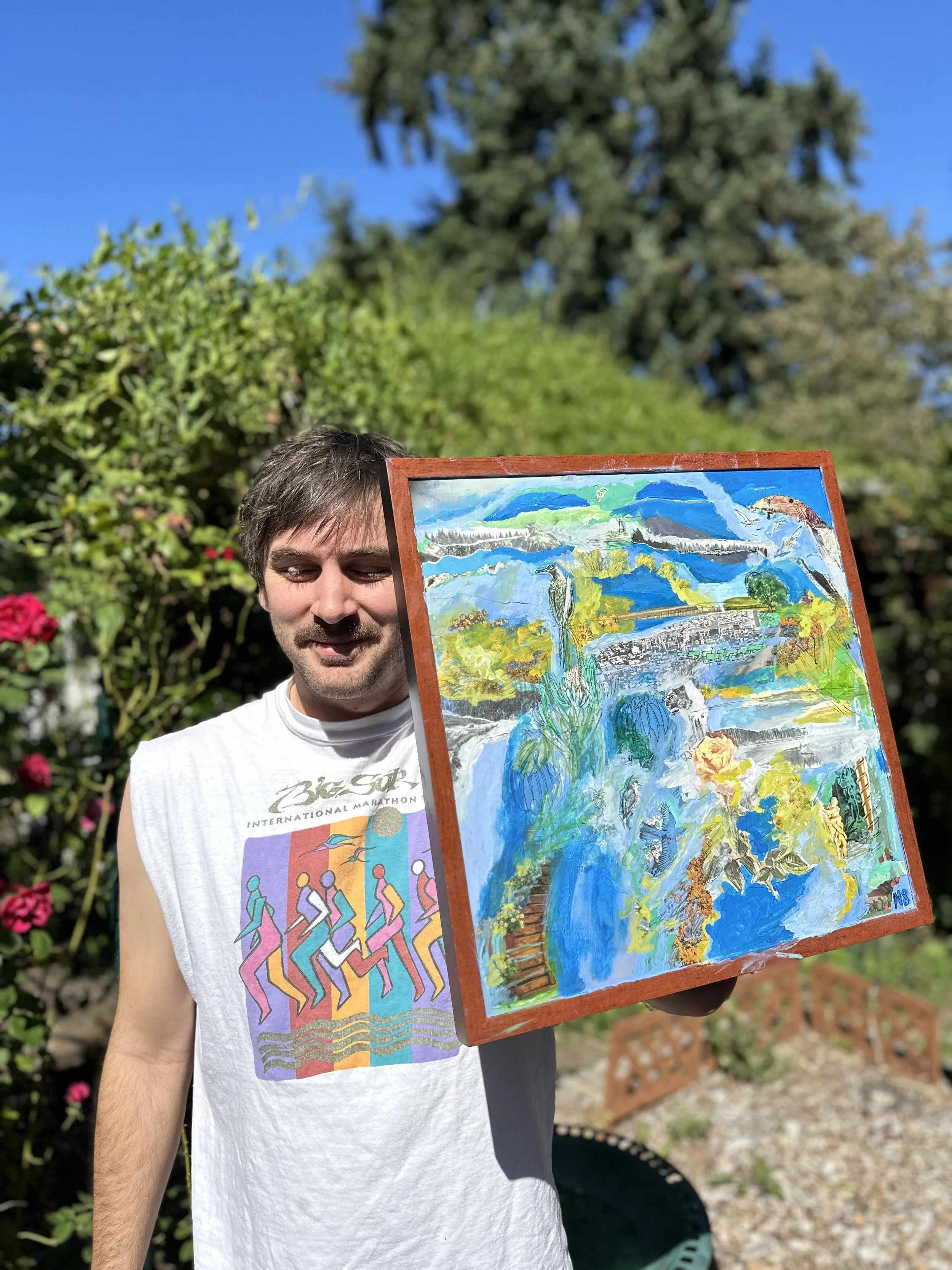 Musician and artist Nate Anderson lives in Portland, Oregon. His sandbox approach to art is a textured and intuitive exploration of materials and feelings. Pushing beyond pastiche into a psychedelic jumble of surprise and harmony between disparate sources. Juxtaposition and storytelling in scraps and shades of old paper and fresh paint. Thrifted continuity. Magical thinking.